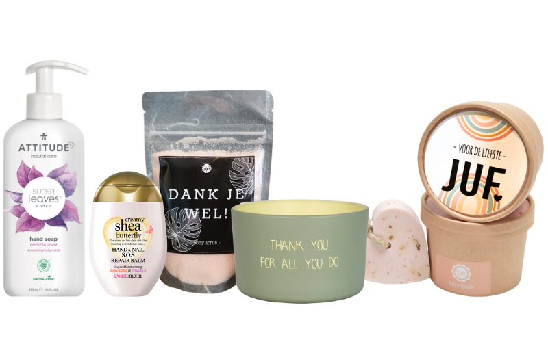 Een compleet cadeau dat ontspanning, verzorging en een glimlach samenbrengt – perfect om je juf in het zonnetje te zetten.