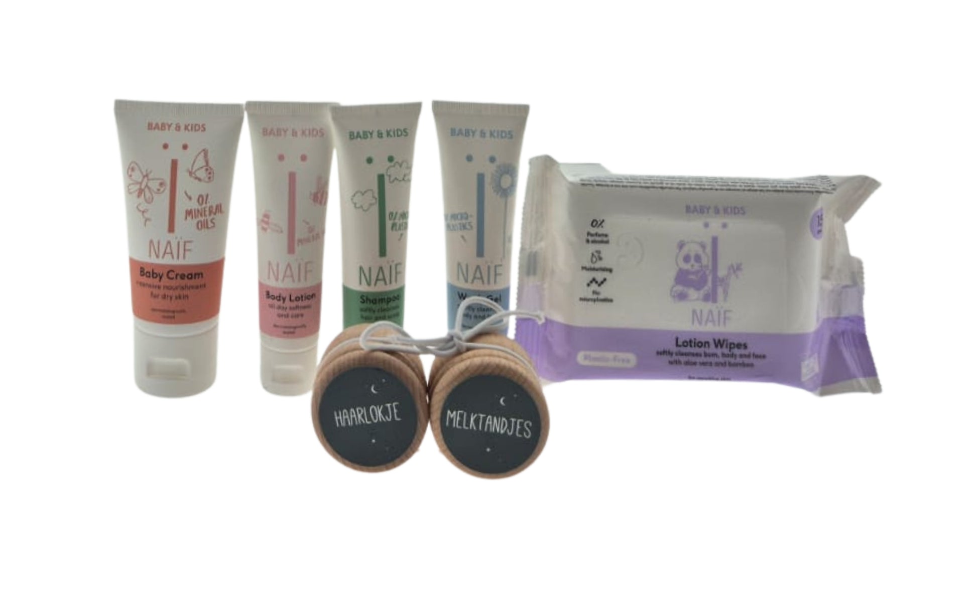 De Naïf Baby Body, Douche & Haar cadeauset is zorgvuldig samengesteld om jonge ouders een compleet en praktisch cadeau te bieden. Met zachte, natuurlijke verzorgingsproducten en een vrolijk extraatje is dit een perfect geschenk voor elke gelegenheid.