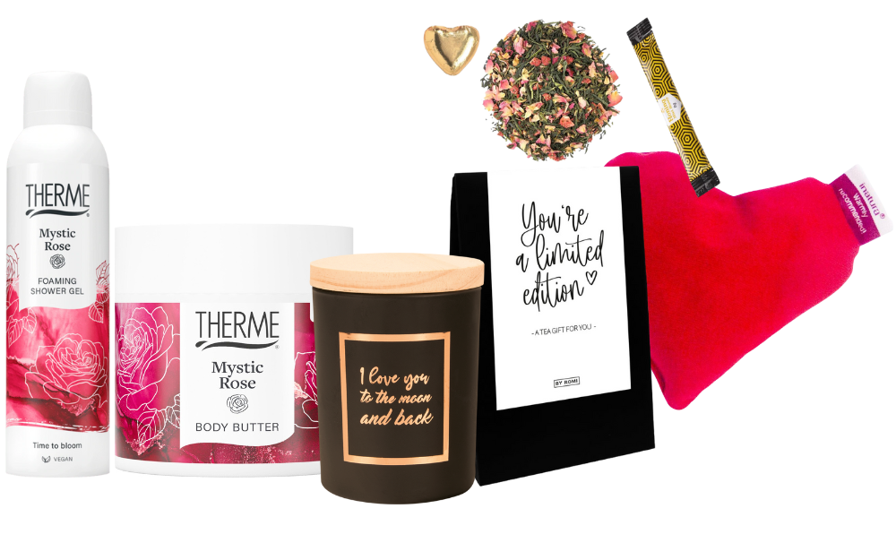 Gevuld met een warm hartje van Kersepitje®, een heerlijke thee, een liefdevol kaarsje en de luxe producten van Therme.