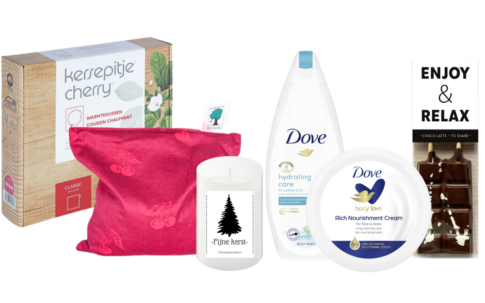 Het perfect cadeau voor de koude wintermaanden en de feestdagen, gevuld met een warmte kussen van Kersepitje®, een mooi kerstkaarsje, luxe chocolade voor warme chocolademelk, en de verzorgende producten van Dove.