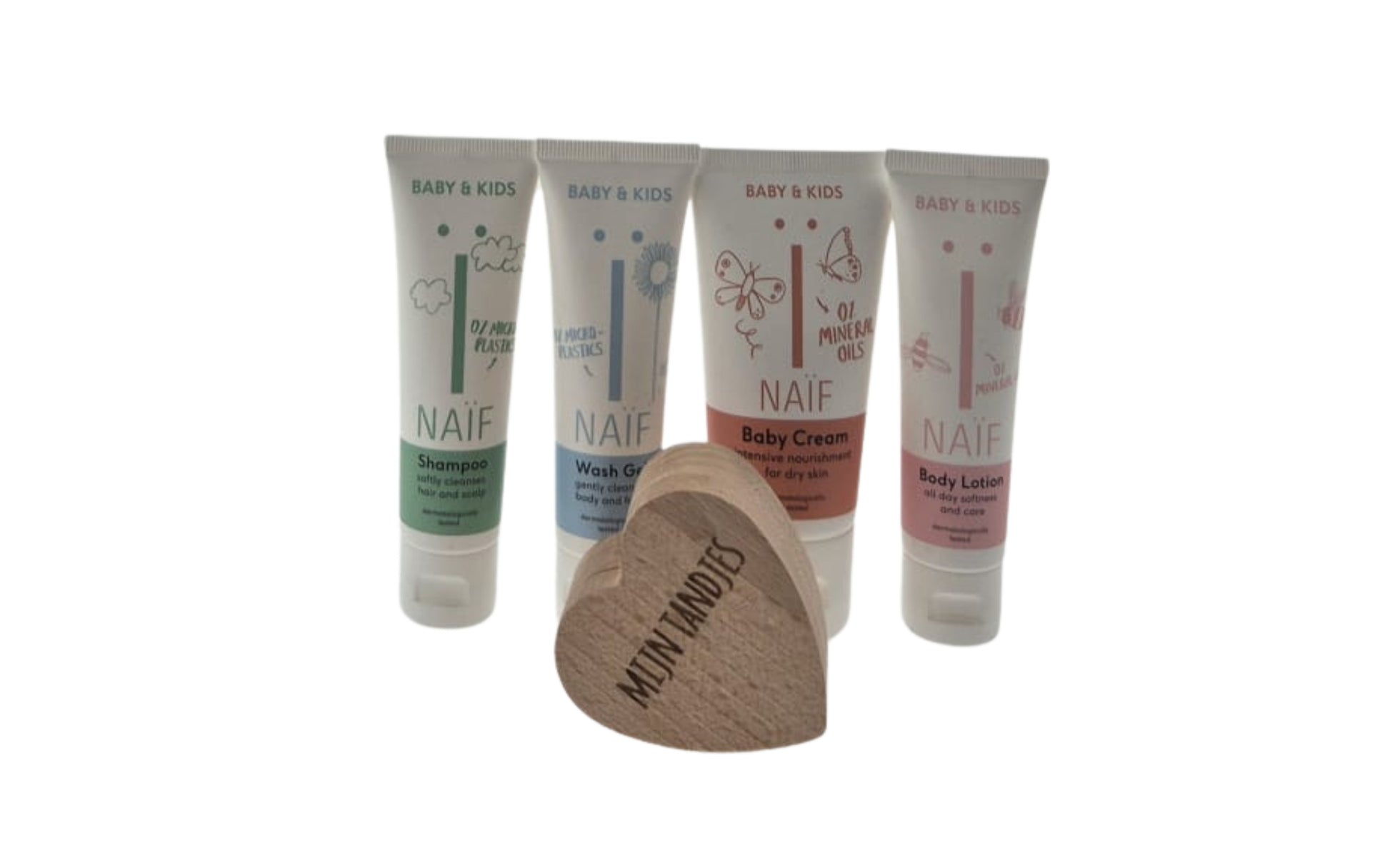 De natuurlijke babyverzorging van Naïf is speciaal ontwikkeld voor de gevoelige babyhuid, vrij van microplastics, parabenen en minerale oliën. Elk product heeft een zachte geur en milde formule die de huid reinigt en verzorgt zonder deze uit te drogen. Het houten hartvormige bewaardoosje maakt het cadeau extra bijzonder: een blijvende herinnering voor de eerste tandjes van je kindje.